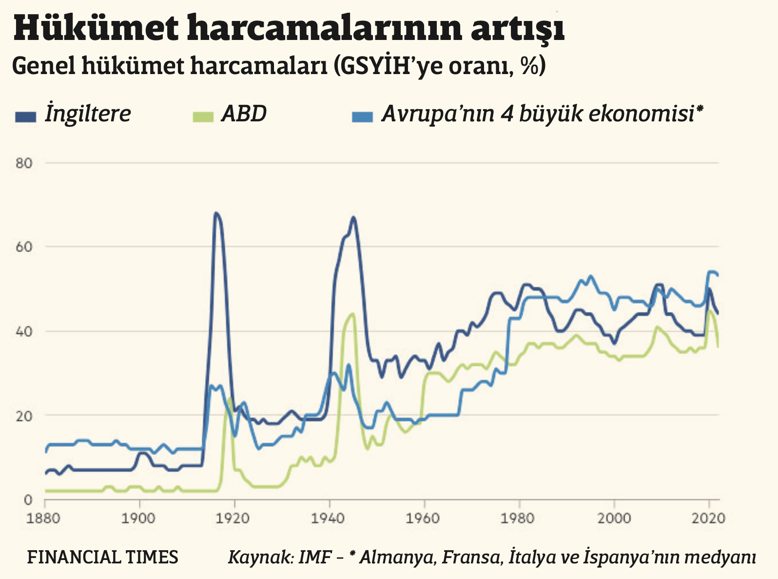 Amerika’nın 1960’lardaki iyimserliğine özlem duyanlar, o dönemde hükümetin daha küçük ve daha az müdahaleci olduğunu unutmamalı. Sosyal demokrasinin o “görkemli” dönemini geri getirmek için daha büyük değil, daha küçük hükümet gerekir. Kapitalizmin bugüne dek devletin kurtarma ve düzenleme konusunda daha hızlı davrandığı, üretkenlik ve ortalama gelirlerdeki büyümenin ise ABD’ye kıyasla daha yavaş olduğu Avrupa’da daha yanlış ilerlediği tartışılmaz. Ancak artık Atlantik’in iki yakası yer değiştiriyor olabilir. Biden döneminde ABD, açıkları ve borçları rekor yolunda ilerleyen, benzerlerinden çok daha hızlı büyüyen fazla aykırı bir ülke haline geldi.