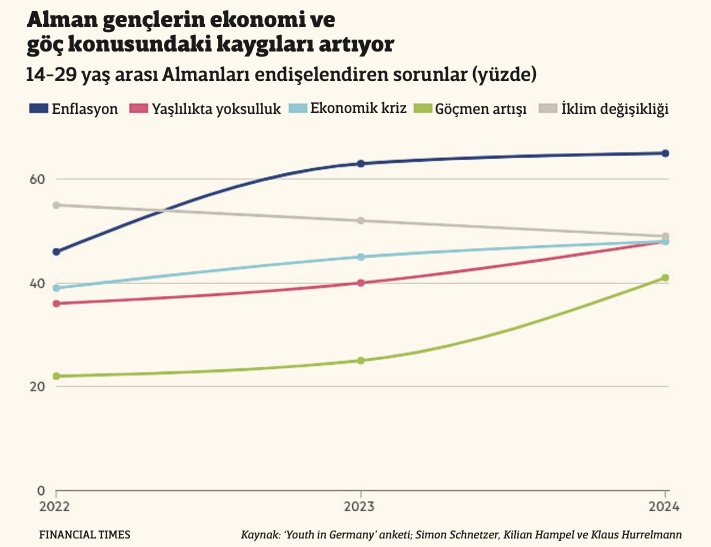 Sağa kayış Alman gençliğiyle yapılan yıllık ankette de bariz biçimde görünüyor. Covid-19 pandemisi, kapanmalar ve okulların tatil edilmesinden ciddi şekilde etkilenen kuşak, devamında Ukrayna savaşı, enflasyon ve süregelen iklim krizinin yarattığı şok dalgalarına tepki vermiş gibi.