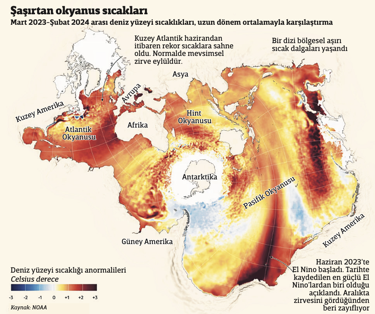 NOAA özellikle Doğu Pasifik ve Büyük Karayipler’deki bazı bölgelerde sıcaklık stresi altında yaşayan mercan resifleriyle de ilgili uyarılarda bulundu.