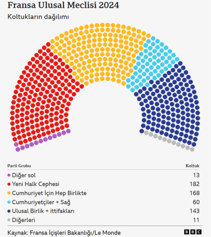 İkinci turun resmi sonuçlarına göre solcu Yeni Halk Cephesi 182 sandalye ile parlamentoda en fazla sandalyeye sahip koalisyon oldu. Macron'un merkezcileri 168 sandalyeye sahip. Marine Le Pen'in aşırı sağcı Ulusal Birlik Partisi ise ilk turda önde gitmesine rağmen 143 sandalyeye sahip. Kimse için çoğunluk yok.