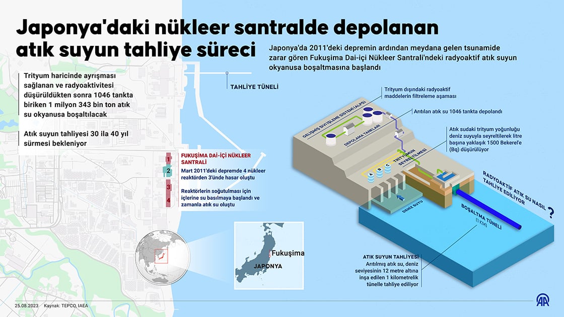 Mart 2024'e kadar toplam 31 bin 200 ton radyoaktif atık suyun tahliyesinin hedeflendiği plan, bölgede yaşayan balıkçıların ve çevre koruma aktivistlerinin yanı sıra başta Çin olmak üzere komşu ülkelerin tepkisine sebep oluyor.