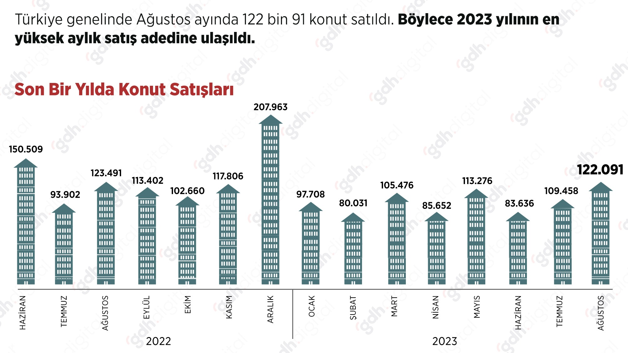 Ağustos ayında 122 bin adedi geçen konut satışları 2023 yılının en yüksek aylık performansı anlamına geliyor. Ayrıca Ağustosa ayı konut satışları 111.713 adet olan son 1 yılın aylık ortalamalarının da üzerine çıktı.