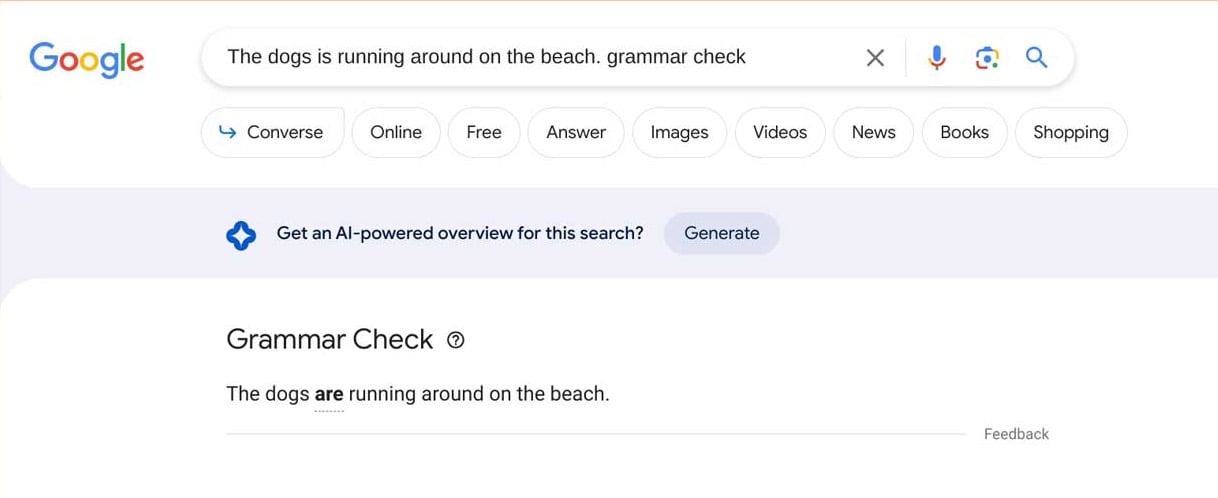 Arama çubuğuna bir metin yazıp, sonuna "grammar check" (dil bilgisi kontrolü) ibaresi eklediğinizde, yapay zeka tarafından desteklenen bu özellik devreye girecek. Böylece cümledeki dil bilgisi hatasını nerede yaptığınızı anlayabileceksiniz, ayrıca Google doğrusunu da gösterecek.