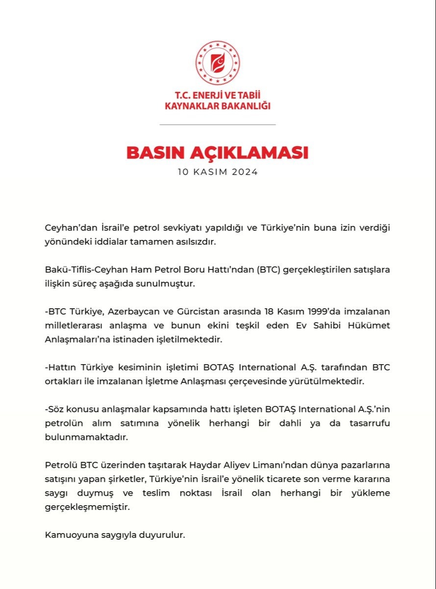 Petrolü BTC üzerinden taşıtarak Haydar Aliyev Limanı'ndan dünya pazarlarına satışını yapan şirketler, Türkiye'nin İsrail'e yönelik ticarete son verme kararına saygı duymuş ve teslim noktası İsrail olan herhangi bir yükleme gerçekleşmemiştir. Kamuoyuna saygıyla duyurulur."