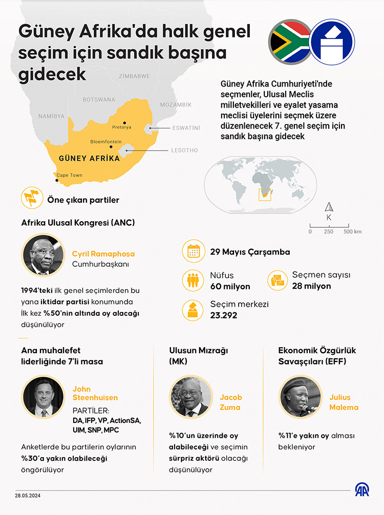 Güney Afrika Seçim Komisyonu'nun (IEC) paylaştığı verilere göre, 60 milyon nüfusa sahip ülkede kayıtlı 28 milyona yakın seçmen, yarın 07.00-21.00 saatlerinde 23 bin 292 seçim merkezinde oy kullanabilecek.