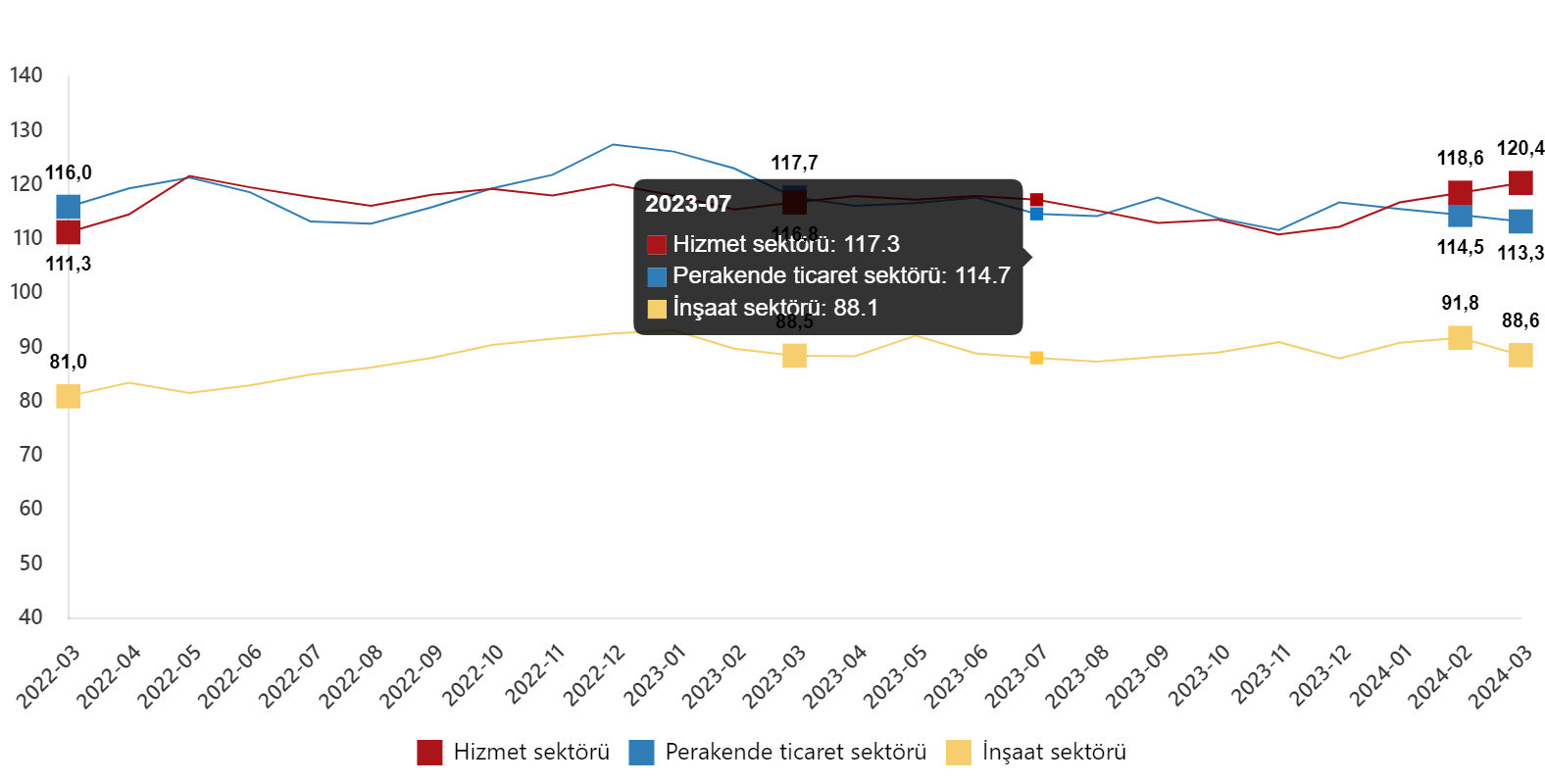 Mevsim etkilerinden arındırılmış güven endeksi Mart ayında bir önceki aya göre; hizmet sektöründe yüzde 1,5 oranında artarak 120,4 değerini, perakende ticaret sektöründe yüzde 1,0 oranında azalarak 113,3 değerini ve inşaat sektöründe yüzde 3,6 oranında azalarak 88,6 değerini aldı.