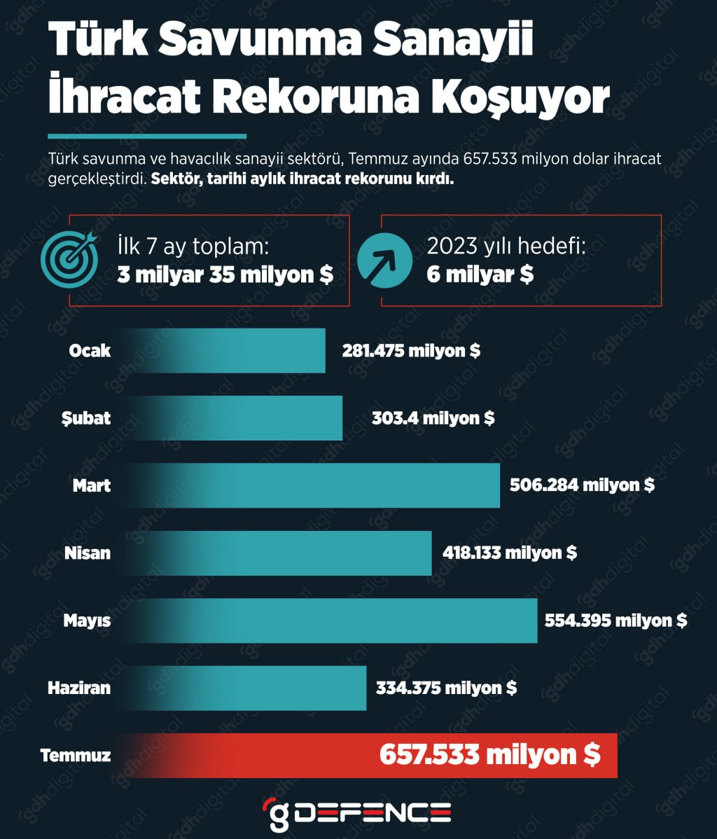 - Temmuz 2023 ihracat verilerine göre Türk Savunma ve Havacılık Sanayi 2023 yılının Temmuz ayında yaklaşık 657.534 Milyon Dolar tutarında ihracata imza attı.