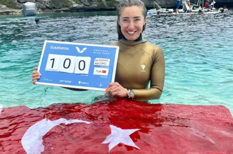 "Milli sporcu Şahika Ercümen, Cumhuriyet'in 100. yılı için gerçekleştirdiği dalışta 100 metreye 3 dakika 14 saniyede dalarak Türkiye rekoru kırdı.