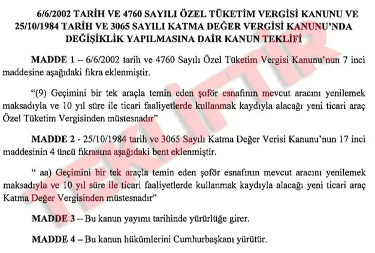 Ticari araçlarla geçimini sağlayan şoför esnafı için de önemli bir düzenleme teklif edildi. Buna göre, yalnızca ticari faaliyetlerde kullanılmak üzere yeni araç alacak şoförlere ÖTV ve KDV muafiyeti sağlanması öngörülüyor. Ancak bu muafiyet, satın alınan aracın 10 yıl boyunca ticari amaçla kullanılma şartına bağlı olacak.