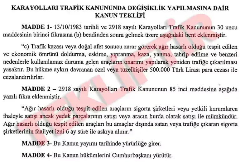 Trafik güvenliğini artırmayı hedefleyen başka bir teklif ise ağır hasarlı araçlara yönelik. Teklife göre, trafik kazası veya doğal afet sonucu ciddi hasar gören araçların onarılıp yeniden trafiğe çıkarılması yasaklanacak. Bu kurala uymayanlara 500 bin TL’ye varan para cezaları uygulanması planlanıyor.