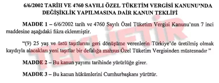 Kanun teklifi, 25 yaşını doldurmuş araç sahiplerini ilgilendiriyor. Teklif kapsamında, bu araçların geri dönüşüme verilmesi şartıyla, Türkiye’de üretilen yeni araçların bir defaya mahsus ÖTV’den muaf tutulması planlanıyor.