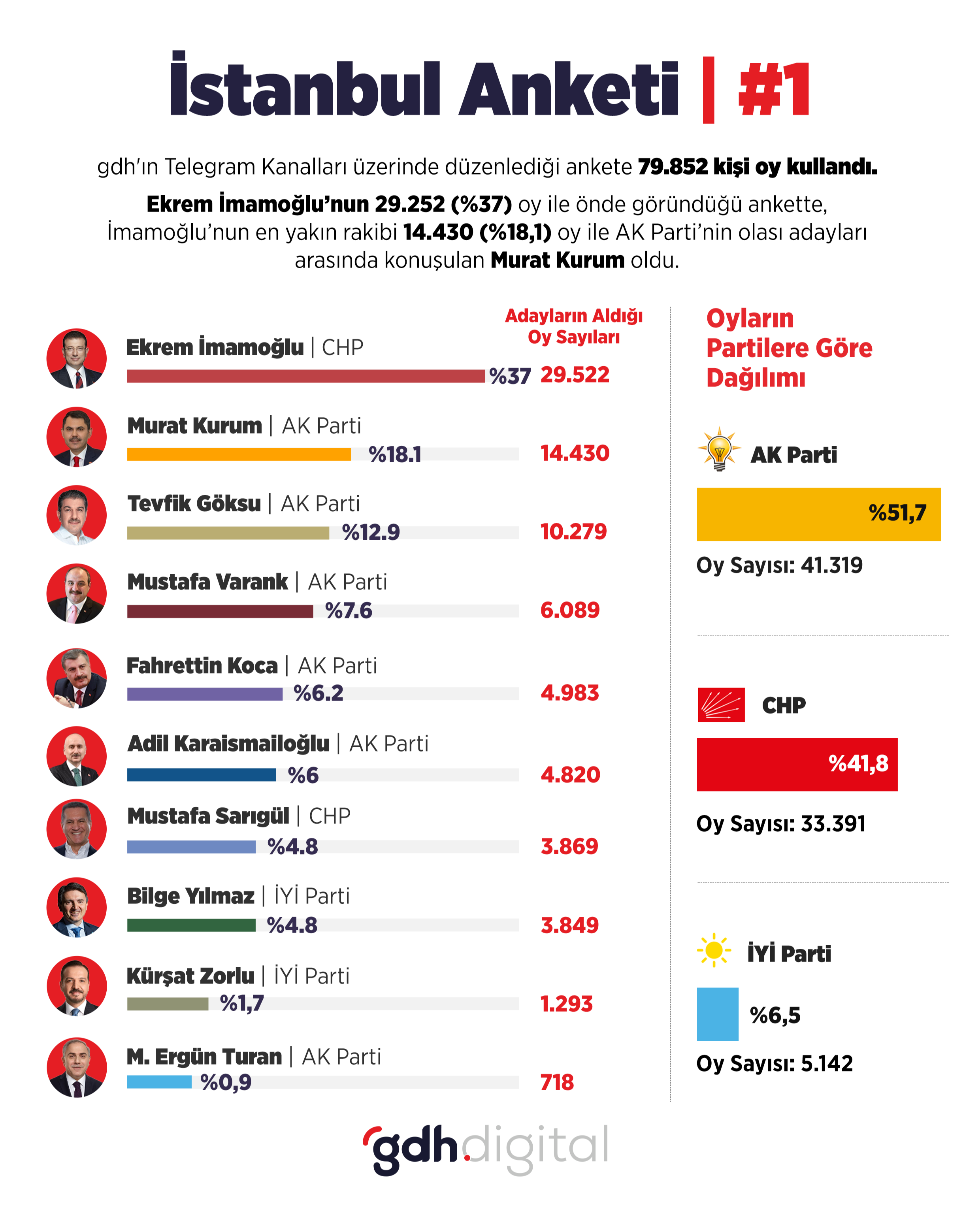 gdh olarak telegram kanalları üzerinden gerçekleştirdiğimiz İstanbul Büyükşehir Belediyesi (İBB) Başkan Adayınız kim anketine 79 bin 852 katılımcı oy kullandı.