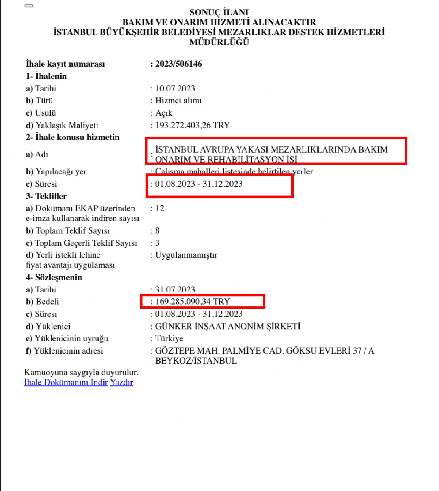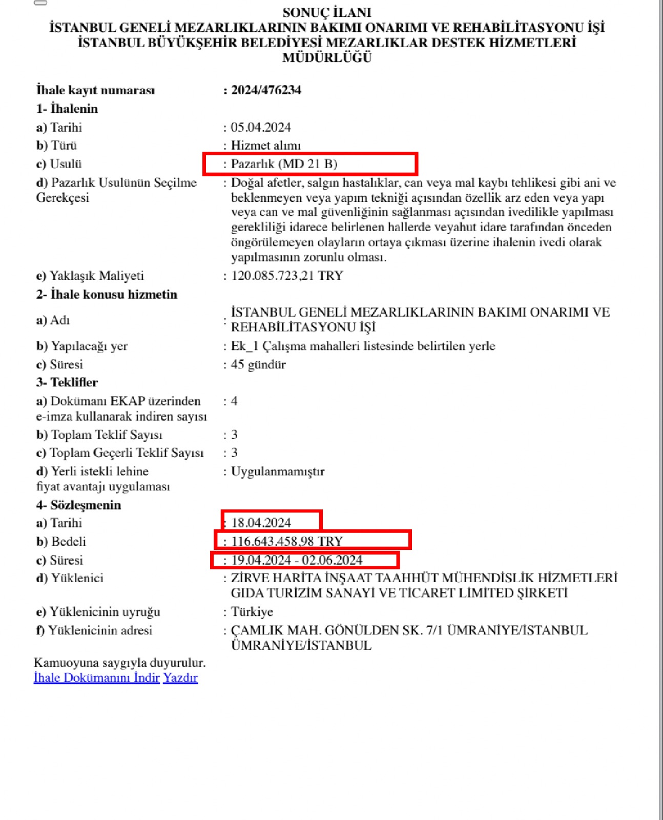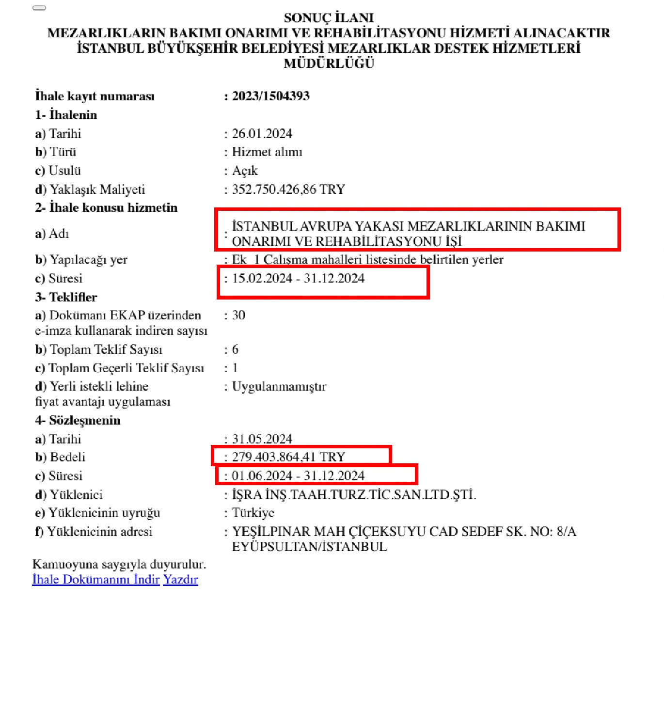 Ekrem İmamoğlu yönetimindeki İstanbul Büyükşehir Belediyesi’ne bağlı Mezarlıklar Destek Hizmetleri Müdürlüğü, Temmuz 2023 ile Nisan 2024 tarihleri arasında, ‘İstanbul Geneli Mezarlıklarının Bakımı Onarımı ve Rehabilitasyonu İşi’ olarak, kısa adı EKAP olan ‘Elektronik Kamu Alımları Platformu’nda sonuç ilanı yayımlanan 5 ihale gerçekleştirdi.