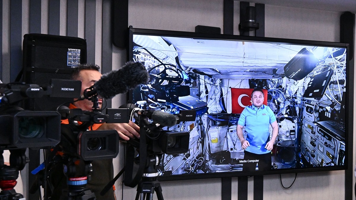Alper Gezeravcı, Türkiye Uzay Ajansı'nda (TUA), Sanayi ve Teknoloji Bakan Yardımcısı Ahmet Yozgatlıgil ve TUA Başkanı Yusuf Kıraç'ın katılımıyla düzenlenen basın toplantısında, Uluslararası Uzay İstasyonu'ndan (ISS) gazetecilerin sorularını yanıtladı.