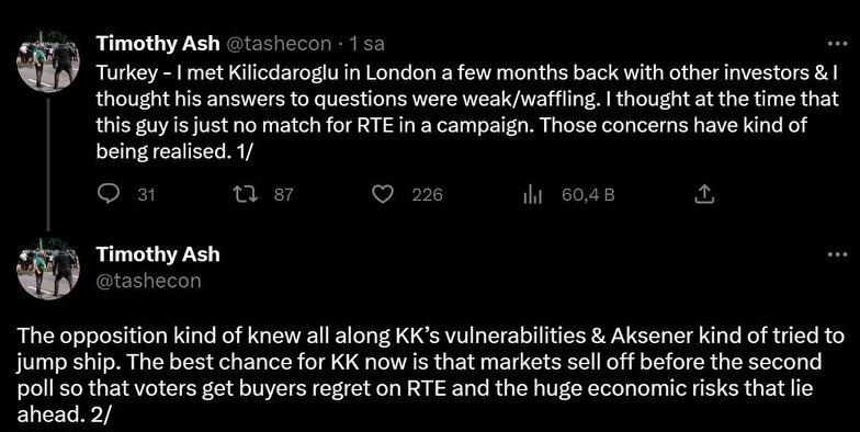 Muhalefet, Kılıçdaroğlu’nun zayıflıklarını başından beri biliyordu ve Akşener bir nevi gemiyi terk etmeye çalıştı. Kılıçdaroğlu için şu anda en iyi şans, ikinci turdan önce borsanın çakılması ve böylece seçmenlerin RTE ve önlerindeki devasa ekonomik riskler konusunda uyarılması.''
