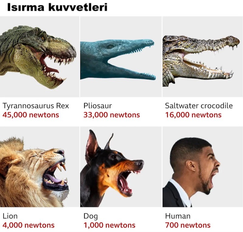 En üst noktada bu yaklaşık 33.000 Newton olarak ortaya çıkıyor. Karşılaştırmak gerekirse, şu anda yaşayan hayvanlardaki en güçlü çenelerin 16.000 Newton ile tuzlu su timsahlarında bulunduğu belirtiliyor.
