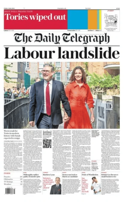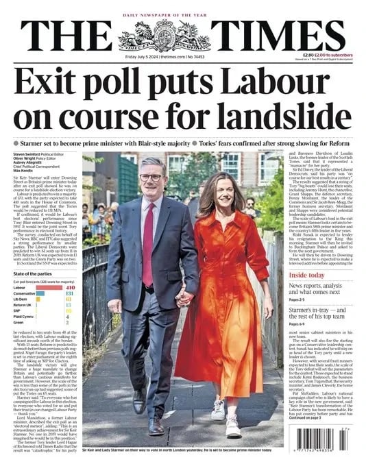 Fotoğraf altı yazısı, Times gazetesi eski İngiltere Başbakanı ve İşçi Partisi lideri Tony Blair iktidarını hatırlatarak, İşçi Partisi'nin şimdiki genel başkanı Sir Keir Starmer'in "Blair'vari bir çoğunlukla başbakan olacağını" yazdı.