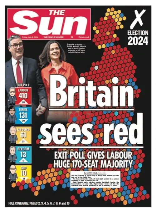 Ipsos tarafından BBC, Sky News ve ITV için yapılan sandık çıkış anketlerine göre İşçi Partisi büyük bir zafer ilan etti. Bu aynı zamanda 14 yıldır iktidarda olan Muhafazakar Parti için büyük bir hezimet anlamına geliyor.