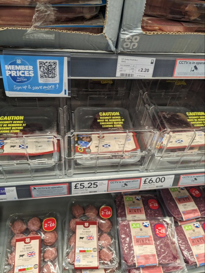 Sosyal medyada yayınlanan fotoğraflara göre farklı süpermarketlerde hırsızlık olaylarına karşı alınan önlemleri görebiliyoruz. Örneğin bir kullanıcı Co-op market zincirinde alarmlı kutuların içinde yerleştirilen et ve süt ürünlerinin fotoğraflarını paylaştı ve şöyle yazdı: “Biftekleri altın külçeleri gibi paketliyorlar.”
