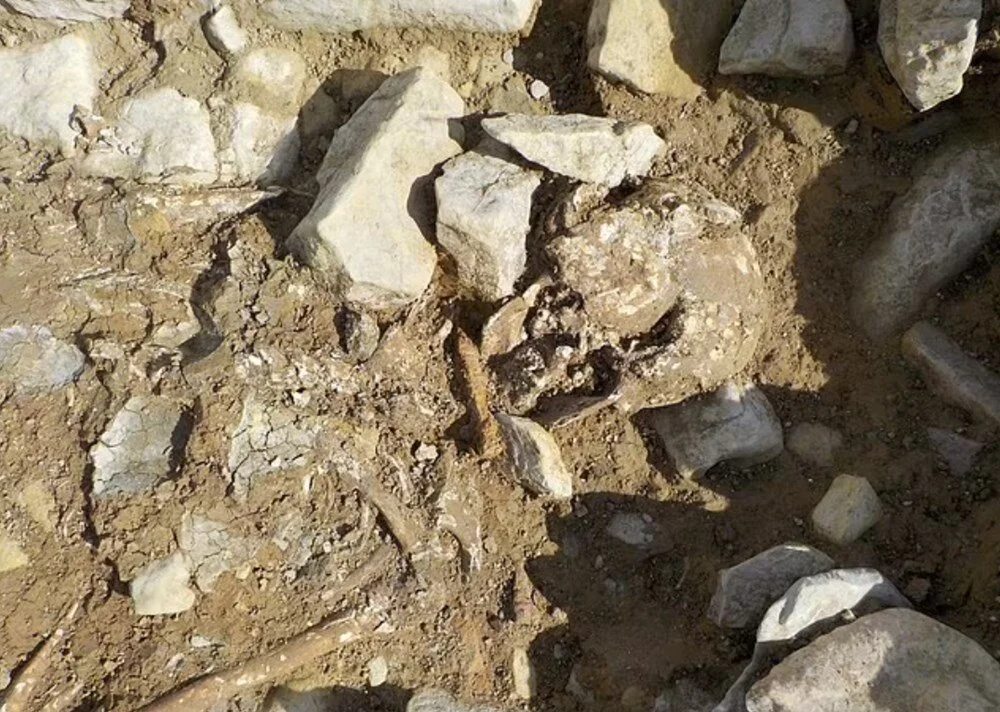 Çömelmiş mezarlardan biri, mezarlığı çevreleyen hendeğe yerleştirilmiş ve üzerine "büyük miktarda taş" yığılmış halde bulundu.