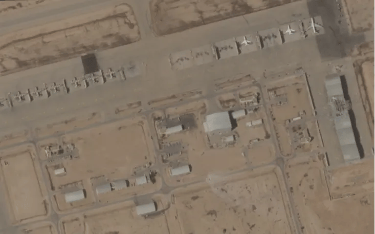 İsrail'in güneyindeki Nevatim hava üssünü gösteren uydu görüntüleri, üs içindeki ana pistin yakınında bulunan binanın kompleksinin çatısında oluşan hasarı gösteriyor. Binanın etrafına dağılmış büyük moloz parçaları görülebiliyor.