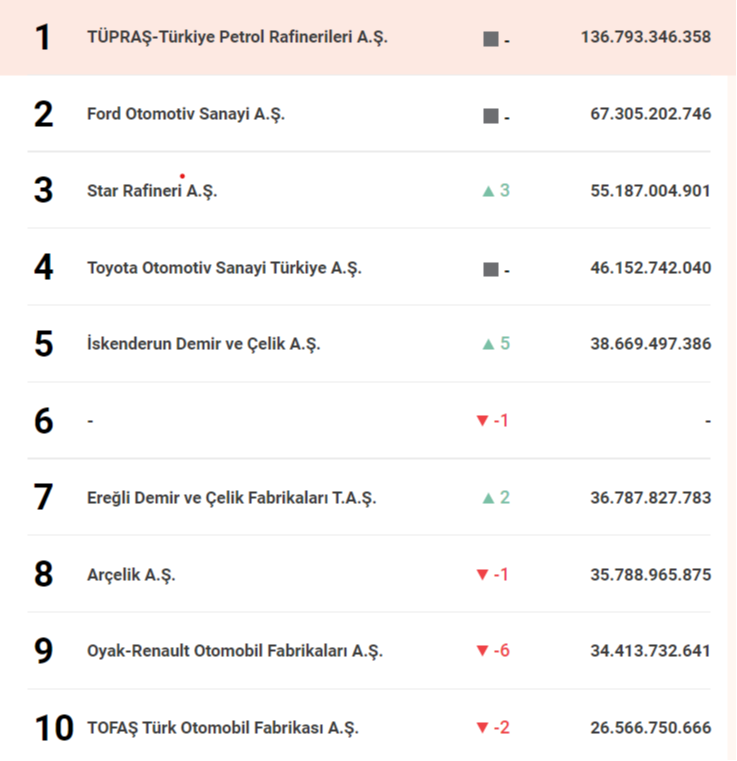 Toyota Otomotiv 65,9 milyar lirayla 7'nci, Arçelik 64,1 milyar lirayla 8'inci, Oyak-Renault 62,7 milyar lirayla 9'uncu, Tofaş 59,8 milyar lirayla 10'uncu sırada yer aldı. Toyota 3 basamak birden gerilerken, Arçelik, Oyak-Renault ve Tofaş'ın sıralamadaki yeri değişmedi.