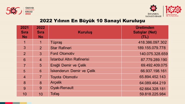 İSO'nun Türkiye'nin 500 Büyük Sanayi Kuruluşu 2022 Araştırması'na göre, TÜPRAŞ, üretimden satışlarda 418,4 milyar lirayla en büyük sanayi kuruluşu oldu.