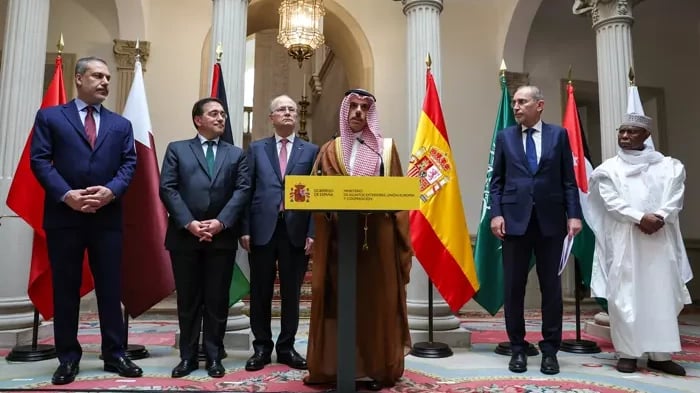 İspanya'nın Filistin devletini tanıma kararının ardından Madrid'e gelen Türkiye Dışişleri Bakanı Hakan Fidan, Filistin Başbakanı ve Dışişleri Bakanı Muhammed Mustafa, Suudi Arabistan Dışişleri Bakanı Faysal bin Ferhan, Katar Dışişleri Bakanı Şeyh Muhammed bin Abdurrahman Al Sani, Ürdün Dışişleri Bakanı Eymen es-Safedi ve İİT Genel Sekreteri Hissein Brahim Taha'nın aralarında bulunduğu Gazze Temas Grubu, ilk olarak İspanya Başbakanı Pedro Sanchez ile bir araya geldi.