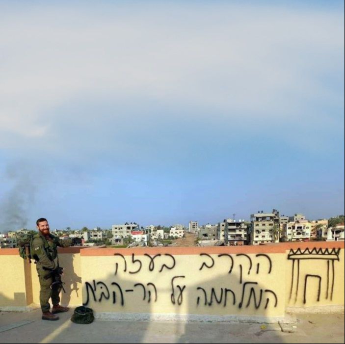 Paylaşımın birinde bombalanmış bir cami minaresinin temeline “Yahudi Mabedi’nin bir an evvel yapılması duasıyla” anlamında “Yibane ha-Mikdaş” (יבנה המקדש) ifadesinin yazılı olduğu grafitinin önüne çömelmiş bir İsrail askerinin resmine, diğerinde ise “Gazze savaşı, Tapınak Tepesi için yapılan savaştır” anlamında “ha-Krav be-Aza: ha-Milhama al Har ha-Bayit” (הקרב בעזה, המלחמה על הר הבית) ifadesinin yazılı olduğu grafitinin yanına dikilmiş bir İsrail askerinin resmine yer verildi.