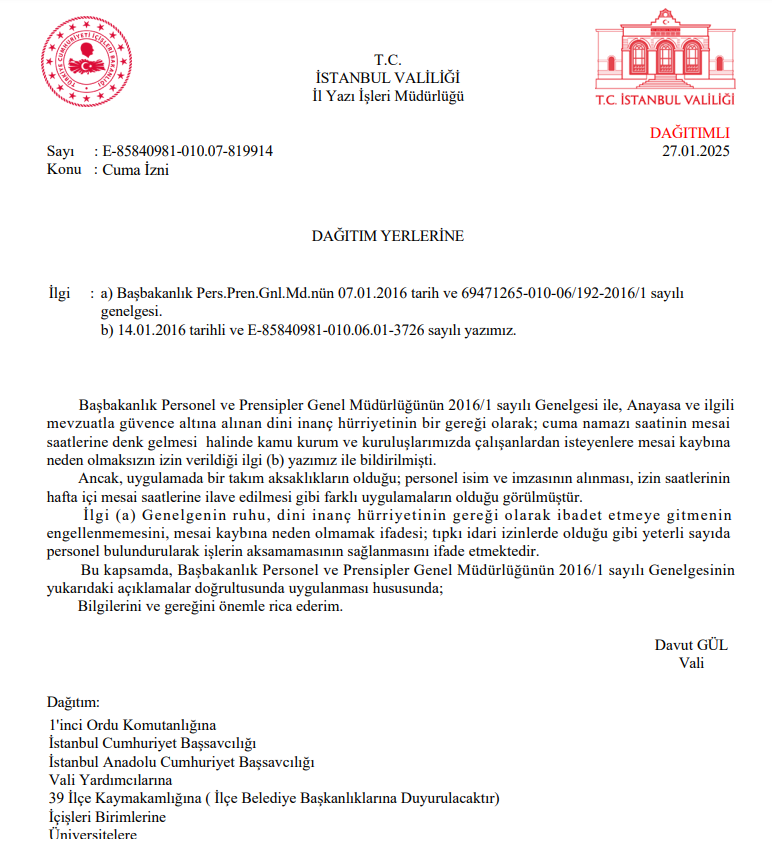 İstanbul Valiliği, kamu kurumlarında çalışanların cuma namazına gitmesine izin verilmesine ilişkin farklı uygulamaların ve aksaklıkların olduğu iddialarına yönelik, kentteki kamu kurumlarına yazı gönderdi.
