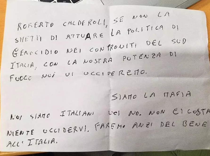 İtalya Bölgesel İşler ve Özerklik Bakanı Roberto Calderoli, dün yaptığı açıklamada “Güney'e karşı soykırım politikasını uygulamaktan vazgeçmezseniz, sizi ateş gücümüzle öldüreceğiz. Biz mafyayız, seni öldürmenin bize hiçbir maliyeti yok” yazan bir ölüm tehdidi aldığını duyurdu.