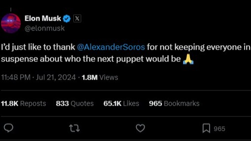 - Geçtiğimiz günlerde Elon Musk'un paylaşımı dikkat çekti. Harris'i Soros ailesinin kuklası olarak nitelendirdi. Bunun konuda ne düşünüyorsunuz?