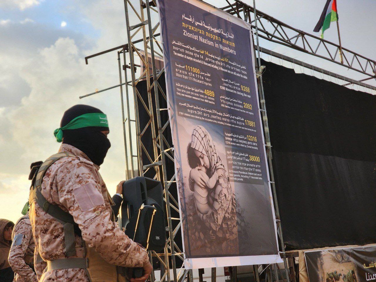 Kassam Tugayları tören alanına "Onları savaş suçlusu Netanyahu ve Nazi Ordusu öldürdü." yazan bir pankart astı.