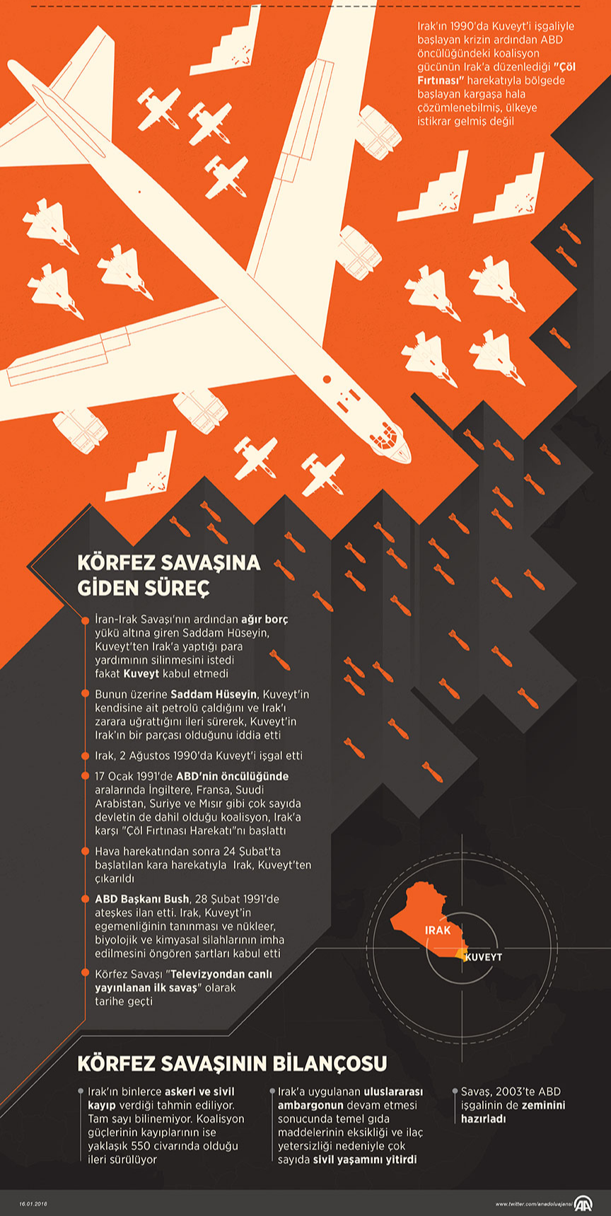 Irak'ın 1990'da Kuveyt'i işgaliyle başlayan krizin ardından ABD öncülüğündeki koalisyon gücünün 17 Ocak 1991'de Irak'a karşı düzenlediği harekatla bölgede başlayan ve süregelen kargaşa hala çözümlenebilmiş değil.