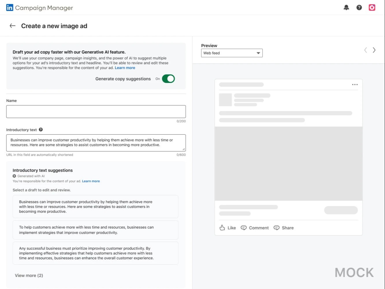 Şimdi ise LinkedIn'in yeni modeli, OpenAI'nın GPT modellerinden faydalanıyor. AI Copy Suggestions, kullanıcılara birden fazla tanıtım metni ve en fazla beş başlık önerisi sunabilecek şekilde tasarlandı. Reklam içeriği oluşturma işlevi Kampanya Yöneticisi üzerinden kullanılabilecek.