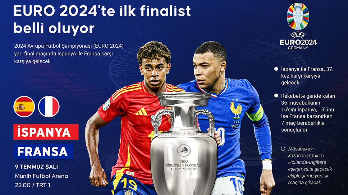 Türkiye’nin turnuvadan elenmesiyle yarı finalistler de belli oldu. Buna göre EURO 2024 yarı final maçları; İspanya - Fransa ve İngiltere - Hollanda arasında oynanacak. İlk yarı final maçı bugün (9 Temmuz) İspanya vs Fransa arasında oynanacak. Yarın (10 Temmuz) İngiltere ve Hollanda adını finale yazdırmak için mücadele edecek.
