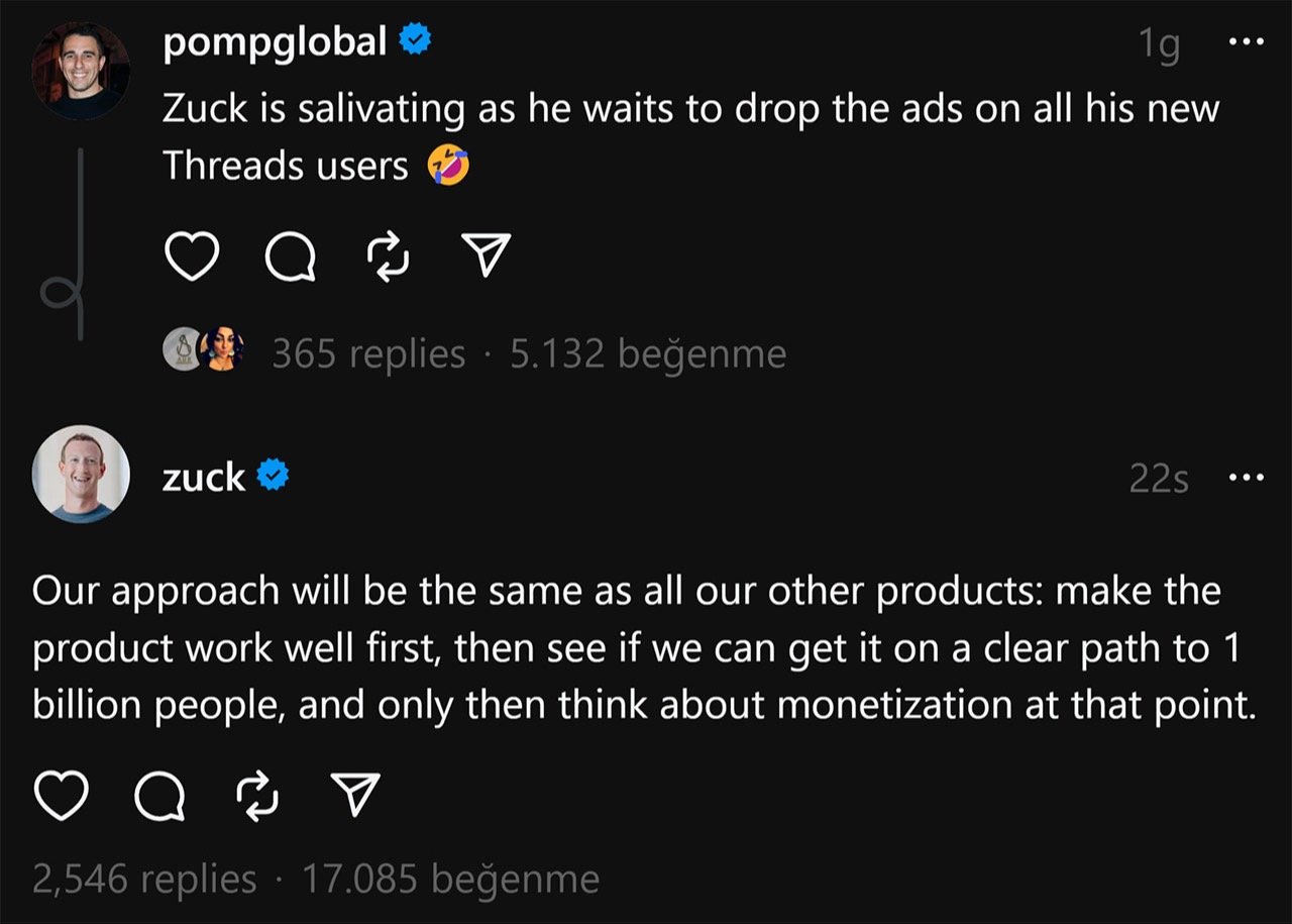 Threads’te “pompglobal”in “Zuck, reklamları tüm yeni Threads kullanıcılarına salmayı beklerken salya akıtıyor.” gibi agresif paylaşımına yanıt veren Zuckerberg, reklamları ne zaman getirmeyi düşündüklerine dair şu yorumu paylaştı: