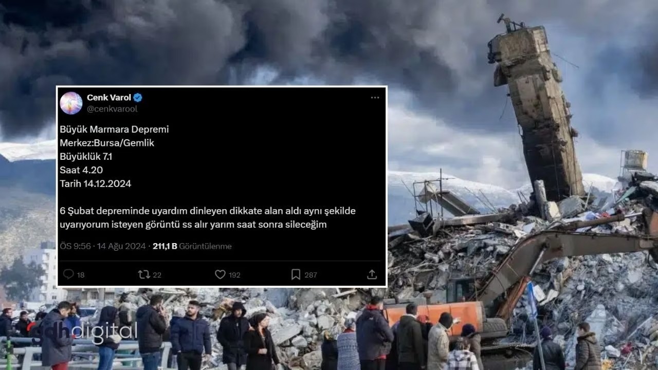 Daha önce Süper Lig ve deprem tahminlerinin gerçekleştiğini iddia eden ancak “gerçekleşen iddiaları”nı X hesabından silen Cenk Varol’un yine sildiği bir başka paylaşımı gündem oldu. O paylaşımda Büyük İstanbul Depremi hakkında gün, saat ve büyüklük gibi değerler paylaşıldı. Varol’a göre Büyük İstanbul Depremi olarak bilinen ve Marmara Depremi olarakta yaşanması muhtemel olan bu deprem 14 Aralık 2024 (14.12.2024) saat 4.20’de gerçekleşecek. Depremin büyüklüğü ise 7.1 olarak açıklanırken depremin merkez üssünün Bursa/Gemlik olacağını iddia etti.