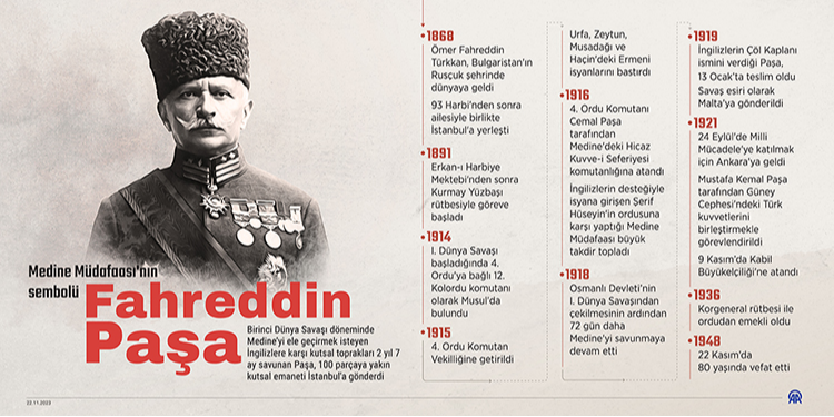 Destansı Medine Müdafaası ile tanınan "Çöl Kaplanı" lakaplı Fahreddin Paşa (Ömer Fahreddin Türkkan), vefatının 75. yılında anılıyor.