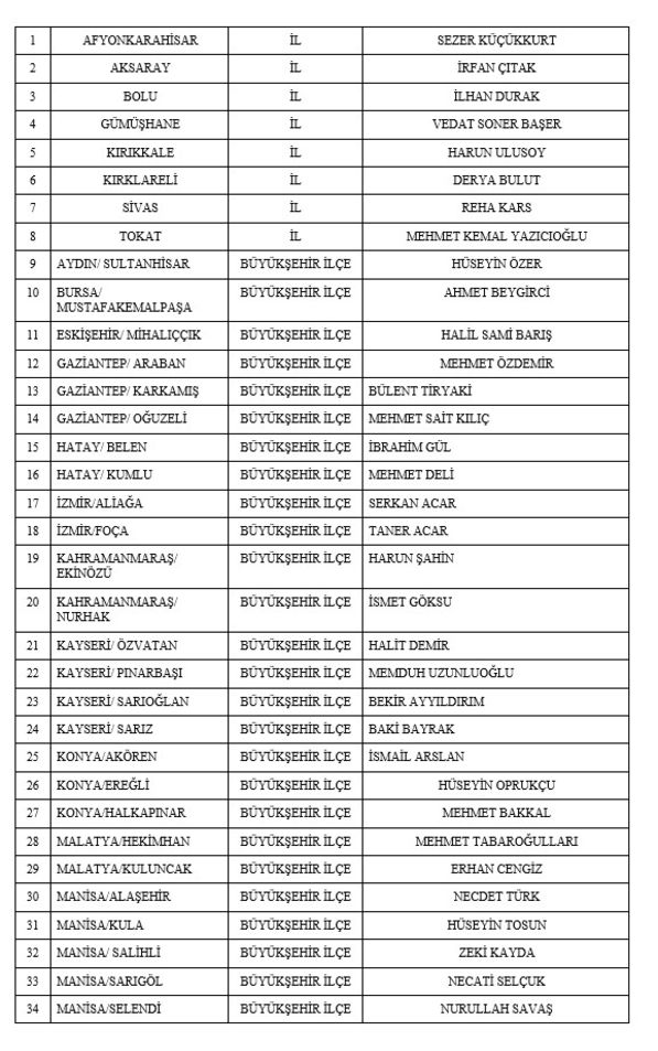 Milliyetçi Hareket Partisi Genel Başkan Yardımcısı Sadir Durmaz ; "Partimizin yetkili kurullarının yapmış olduğu değerlendirme ve Genel Başkanımız Sayın Devlet BAHÇELİ’nin onayları sonucunda 31 Mart 2024 Mahalli İdareler Seçimlerinde 2. etap olarak adaylıkları kesinleşen 8 İl, 40 Büyükşehir İlçe, 7 İlçe Belediye Başkan Adayımız olmak üzere toplam 55 adayımızın isim listesi aşağıdadır" ifadelerini kullandı.