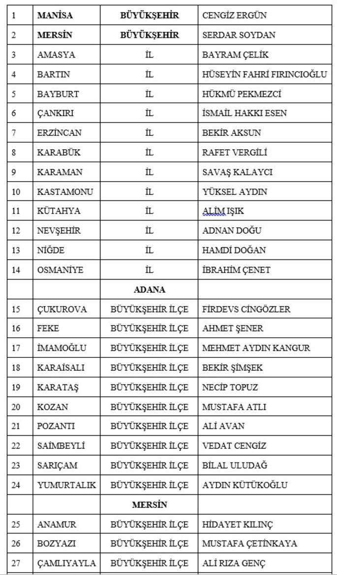 Milliyetçi Hareket Partisi Genel Başkan Yardımcısı Sadir Durmaz " Partimizin yetkili kurullarının yapmış olduğu değerlendirme ve Genel Başkanımız Sayın Devlet Bahçeli’nin onayları sonucunda 31 Mart 2024 Mahalli İdareler Seçimlerinde adaylıkları kesinleşen 2 Büyükşehir, 12 il ve 41 Büyükşehir İlçe Belediye Başkan Adayımız olmak üzere toplam 55 adayımızın isim listesi aşağıdadır." dedi.