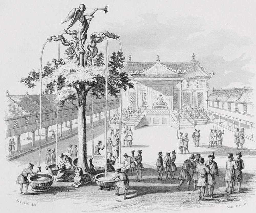 Temel işlevi bir kenara bırakırsak, hanın içme çeşmesi muhteşem bir şekilde büyük, göz alıcı bir parçaydı. Kesinlikle William'ın dikkatini çekmişti; aksi takdirde Moğol sarayını Saint-Denis köyü ile olumsuz bir şekilde karşılaştırmıştı.