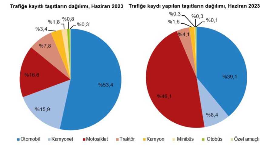 Haziran 2023 itibarıyla trafiğe kaydı yapılan taşıtların dağılımına baktığımızda büyük payın %46,1 ile motosikletlere ait olduğunu görüyoruz.