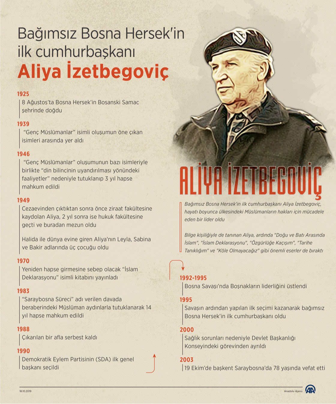 Eski Yugoslavya döneminde Müslüman Boşnakların dini ve milli bilincini uyandırmak için mücadele eden ve bu uğurda iki kez hapse atılan bağımsız Bosna Hersek'in ilk Cumhurbaşkanı Aliya İzzetbegoviç, vefatının 20. yılında anılıyor.