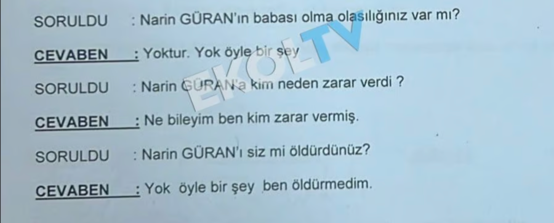 Öte yandan Narin’in katili kim? Konusunda birden fazla iddia bulunuyor. En son edinilen bilgiye göre, gözaltına alınan şahıslardan biri: "Narin'in amcası cesedi çuval içinde bana verdi, dereye götürdüm." dedi.