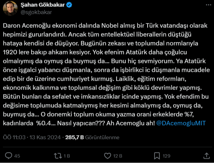 "Daron Acemoğlu ekonomi dalında Nobel almış bir Türk vatandaşı olarak hepimizi gururlandırdı. Ancak tüm entelektüel liberallerin düştüğü hataya kendisi de düşüyor. Bugünün zekası ve toplumsal normlarıyla 1920’lere bakıp ahkam kesiyor. Yok efenim Atatürk daha çoğulcu olmalıymış da oymuş da buymuş da... Bunu hiç sevmiyorum. Ya Atatürk önce işgalci yabancı düşmanla, sonra da iş birlikçi iç düşmanla mücadele edip bir de üzerine cumhuriyet kurmuş. Laiklik, eğitim reformları, ekonomik kalkınma ve toplumsal değişim gibi köklü devrimler yapmış. Bütün bunları da sefalet ve imkansızlıklar içinde yapmış. Yok efendim bu değişime toplumu da katmalıymış her kesimi almalıymış da, oymuş da, buymuş da... O dönemki toplum okuma yazma oranı erkeklerde yüzde 7, kadınlarda yüzde 0,4... Nasıl yapacaksın??? Ah Acemoğlu ah!"