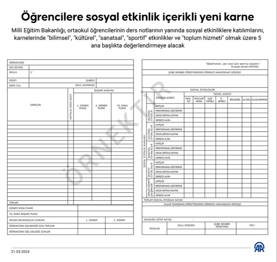 2023-2024 eğitim öğretim dönemi sonunda ilk kez dağıtılmaya başlanacak yeni tasarımlı karnelere, sadece akademik başarı değil, sosyal etkinlikler de işlenecek.
