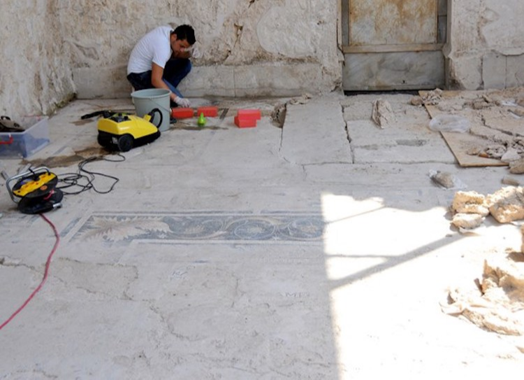 “Dükkanlar içinde en büyük mekan olarak görünen bu dükkanın kazısına başladık. Üst seviyeden aşağıya indikçe özellikle güney duvarda freskolar, duvarın ortasında alt seviyedeki niş çok ilgimizi çekti. Nişin önünde zemine doğru inen yaklaşık 2.5 metre derinliğinde, içerisi suyla dolu bir su kuyusu açığa çıkarıldı. Kuyunun suyunun boşaltılması sonrasında içinde çok sayıda pişmiş toprak testiler, kaplar, bardak açığa çıkınca, buranın bir adak kuyusu olarak kullanıldığı anlaşıldı. Daha sonra mekanın zemininde yapılan kazı çalışmalarında açığa çıkan mozaik ve bir altarın varlığı, bu mekanın bir kült mekan olduğunu bize gösterdi. Mozaikte Truva Savaşı ile ilişkilendirilen bir kurban sahnesi vardı. İphigeneia’nın kurban edilmesi ve Artemis’in kurban edilme anında gökyüzünden bir geyik indirmesi tasvir edilmiş. Antalya Restorasyon ve Konservasyon Bölge Laboratuvarı Müdürlüğü uzmanları tarafından duvarların freskolarının konservasyon ve restorasyonu geçen yıl tamamlandı. Geçici olarak mekanın korunmasına yönelik bir üst çatı oluşturduk. Bu yıl ise zemindeki bu mozaikle ilgili çalışmalarımız yine Antalya Restorasyon ve Konservasyon Bölge Laboratuvarı Müdürlüğü uzmanları tarafından sürdürülüyor.”