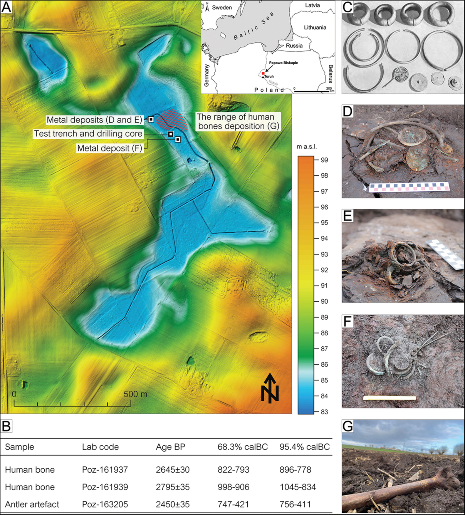 Papowo Biskupie'deki alanın topografyası, kurutulmuş gölün rekonstrüksiyonu (A) ve metal yataklarının in situ görünümleri (D-F). MS on dokuzuncu yüzyılın sonlarında gölün kurutulmasıyla bir metal birikintisi (C) de ortaya çıkarılmıştır (Semrau Referans Semrau1917).