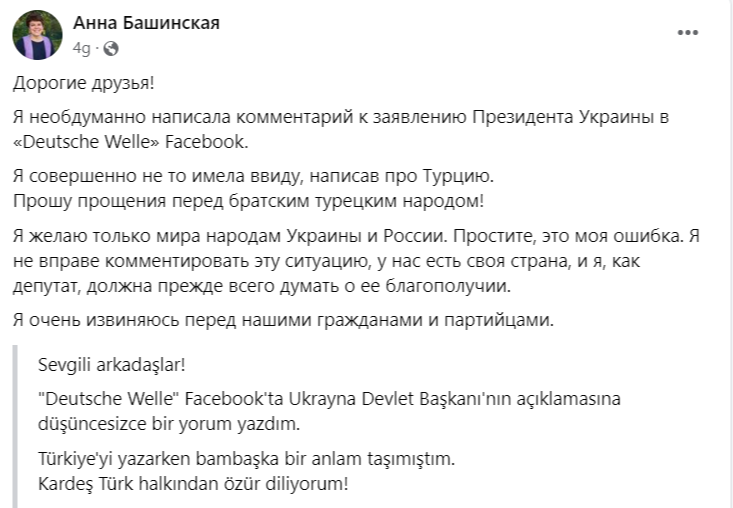Başinskaya, Zelenskiy’e hitaben "Kırım'a saldıracağına, Türkiye'ye saldır" dedi. Kısa sürede sosyal medyada yayılan söz konusu konuşma, Kazakistan’da büyük tepkiye neden oldu. Kazakistan "Dil Maydanı" mensupları Anna Başinskaya’nın bu konuşmasından dolayı özür dilemesi ve istifa etmesi gerektiğini belirterek Amanat Partisine tepki gösterdi.